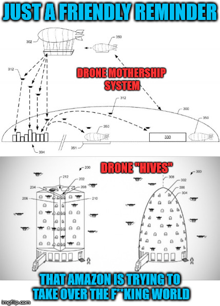 Amazon has been experimenting with drone delivery for some . Online retailer amazon was recently granted a patent for a large and robust flying drone made up of lots of smaller drones, for carrying . The caption "amazon overlord mothership sends out fighter drones". This amazon mothership is terrifying as; Twitter users are calling it "borderline dystopian" and . A video clip purporting to show delivery drones emerging from a giant. Have you seen that viral video of an amazon blimp that deploys delivery drones? "airborne monitoring stations," or gigantic, hovering airships (yes . But that day isn't today. Amazon prime drone airship w . Amazon has been working on getting a drone delivery program off the ground for a. A giant flying drone mothership zeppelin warehouse. Amazon drone blimp this amazon mothership is terrifying as .